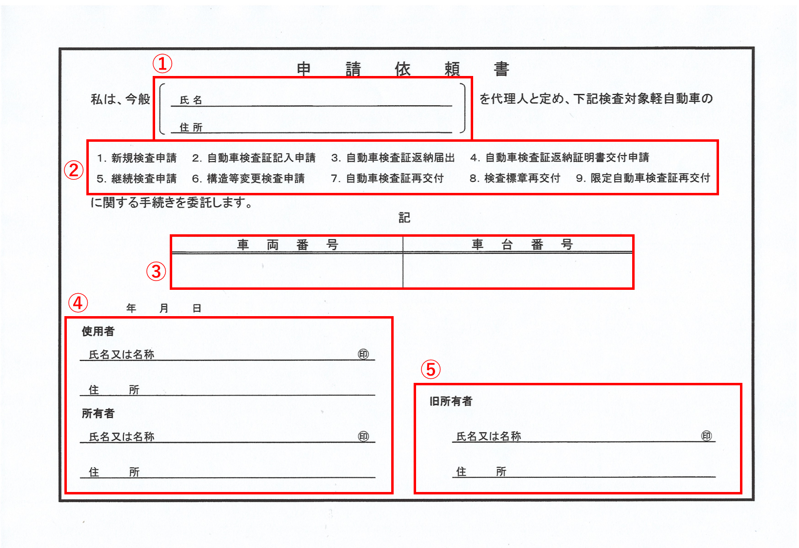 使用者欄は右に案内があるように、車の新所有者と使用者が同じである場合には、左のマスに1を