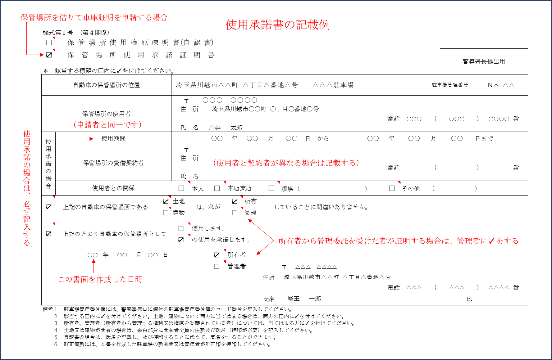 ます。ただし、保管場所の位置、契約期間、貸主、借主(申請者)の記名押印があるものが必要で